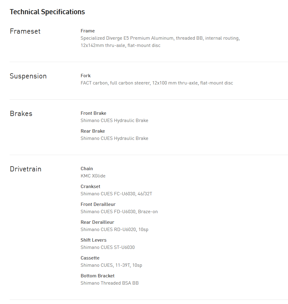 - Our Premium E5 Aluminum frame provides a stiff, light, and durable platform. When mated to our full carbon FACT fork, the Diverge E5 becomes a light, lively and versatile bike ready to attack any surface.