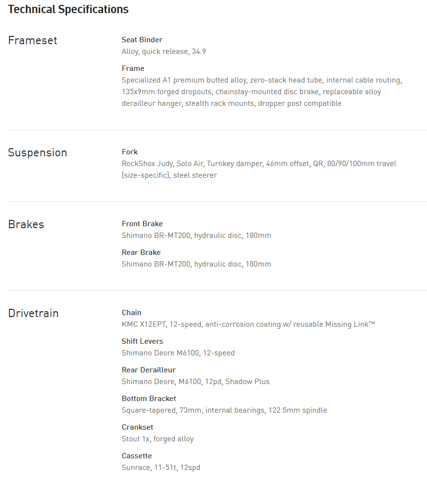 Roll the credits to discover an RockShox Judy, Specialized Alloy wheelset, Shimano BR-MT200 hydraulic stoppers, and Shimano's wide-range 1x12 drivetrain. You have backup provided by a supporting cast that’s all thriller and no filler but it will never leave you hanging.