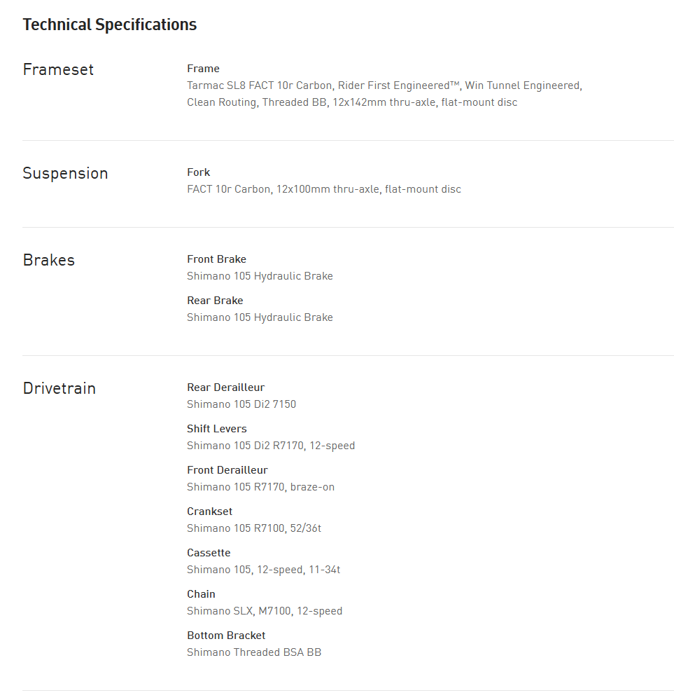 - GOES LIKE HELL, RIDES LIKE HEAVEN: With massive gains in stiffness-to-weight - an improvement of 33% over the SL7 - the Tarmac SL8 takes legendary handling, aggressive responsiveness and World Championship proven geometry to the next level. The bike is stiffer at the pedals, more precise at the bars, and combines it with a compliant ride in the saddle that sets a new benchmark for race bike comfort. Thanks to our Rider-First Engineering, every rider, regardless of size, gets the same unprecedented ride quality and handling. In the saddle the Tarmac SL8 delivers 6% more compliance, floating over rough road with a supple feel unique in the high strung world of race bikes. Tarmac’s proven geometry and 32mm tire clearance are identical to the SL7, ensuring easy adaptation and the versatility to run higher volume tires when needed.